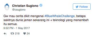 Publik figur dan selebriti Indonesia, Christian Sugiono Senin (1/5) memposting soal tantangan tidak masuk akal bernama Blue Whale Challenge. Melalui akun twitternya, Christian menjelaskan beberapa poin mengejutkan dari tantangan gila ini.